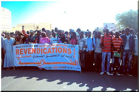 Snem Mauritanie - Ce Mardi 08 Avril 2014, la Coalition des Syndicats Etudiants (UEN, UAEM, ULEM et le SNEM) a marché sur le Ministère de l’Enseignement Supérieur et de la Recherche Scientifique, pour manifester sa colère, son mécontentement face à l’indifférence et la sourde oreille des autorités par rapport à la plateforme revendicative qui leur a été soumise depuis belle lurette.