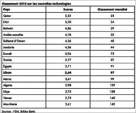 L'Orient le Jour - Selon l'indice du Forum économique mondial (FEM) intitulé « Networked Readiness » et cité par le Lebanon this Week de Byblos Bank, le Liban s'est classé à la 97e place parmi 148 économies dans le monde et 10e parmi 15 pays arabes. Le pays est par ailleurs arrivé 29e parmi 39 pays à revenus moyens supérieurs (PRMS) inclus dans l'étude.