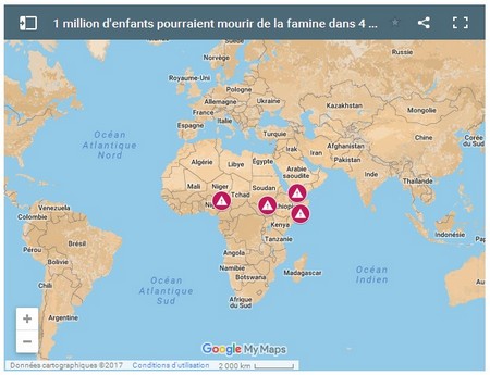 «Le temps presse», alerte l'Unicef. Près de 1,4 million d'enfants risquent de mourir de la famine cette année, selon un bilan dressé par le Fonds des Nations unies pour l'enfance. La famine s'étend en effet dans plusieurs pays, notamment au Nigeria, en Somalie, au Soudan du sud et au Yémen (voir la carte interactive ci-dessous). Lundi, le gouvernement du Soudan du Sud a d'ailleurs officiellement déclaré l'état de famine dans plusieurs zones du pays.