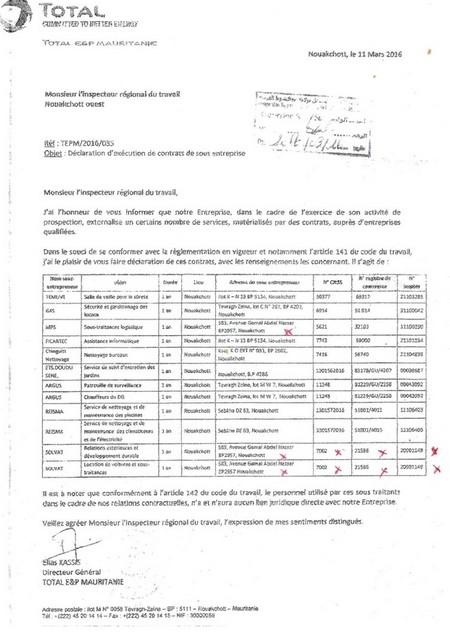 Elle a agréé des sociétés de location de voitures pour en faire des agences, d’une société spécialisée dans plusieurs domaines et notamment dans le domaine de l’environnement et de la Biodiversité. Tout cela confirme les mauvaises pratiques de la société, toujours est-il qu’une grande société ne doit pas s’appuyer sur de petits bureaux d’agences de location de voitures comme elle le fait au vu et au su des hauts responsables de l’énergie et du pétrole, des autorités compétentes et de certaines petites sociétés fictives. Elle confirme avec ces pratiques frauduleuses la gravité de la situation. Ceci justifie largement le degré d’infraction à l’égard de TOTAL E.P-Mauritanie.
