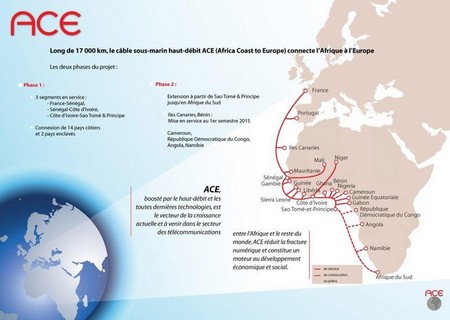 Un consortium d’une vingtaine d’entreprises spécialisées dans les télécommunications, comme Orange, a investi 700 millions de dollars pour déployer un câble sous-marin de 17 000 km, appelé ACE pour African Coast European.
