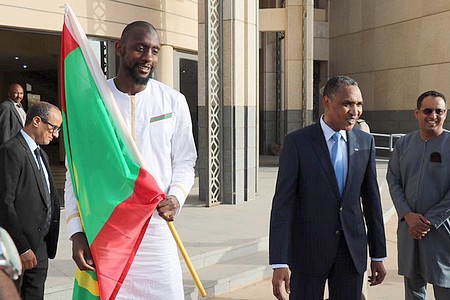 AMI - Le drapeau national a été remis, vendredi à Nouakchott, au nom du Président de la République, Monsieur Mohamed Ould Abdel Aziz, par le Premier ministre, Monsieur Mohamed Salem Ould Béchir, au capitaine de l’équipe nationale les Mourabitounes, qualifiée pour la 19ème session de la coupe d’Afrique des nations, prévue en Égypte 2019, le joueur Abdoul Ba.