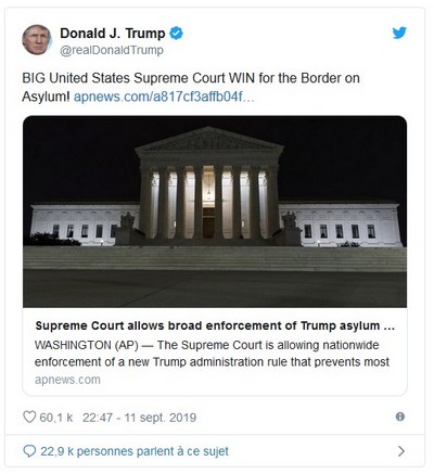 13-09-2019 00:00 - États-Unis: la Cour suprême donne raison à Trump sur une loi sur le droit d'asile