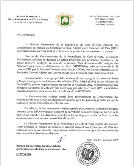 Dans une note diplomatique adressée au Bureau du Secrétaire général adjoint aux Opérations de paix des Nations Unies à New York, la mission permanente de la Côte d’Ivoire informe de sa décision de retrait progressif de ses personnels militaires et de police déployés au sein de la MINUSMA.