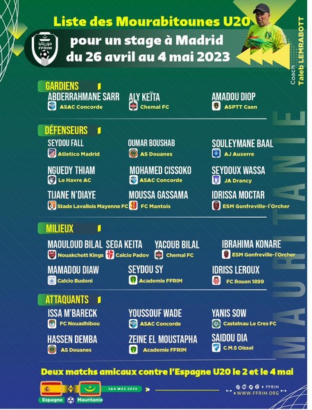 Ainsi, un stage est organisé à Madrid en Espagne, du 26 avril au 4 mai 2023. Il sera ponctué par des matchs amicaux. Les jeunes mauritaniens joueront une double confrontation contre la sélection U20 de l’Espagne. Les deux rencontres sont prévues pour les mardi 2 et jeudi 4 mai 2023.