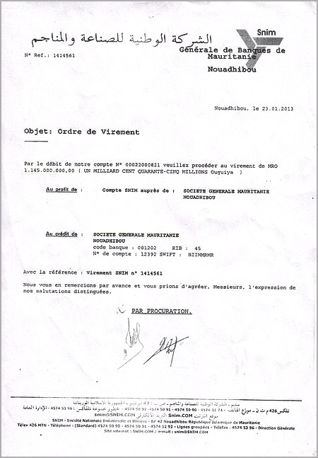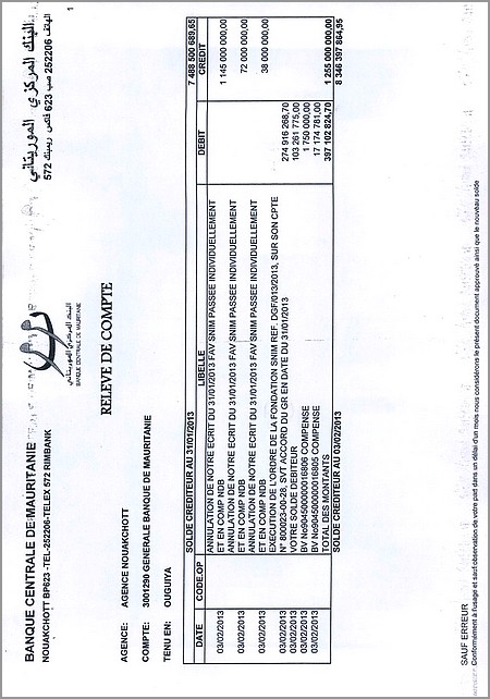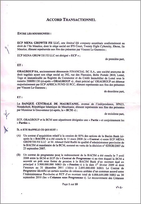 Par ailleurs, dans le contrat avec les fonds américains ECP, le gouverneur de la Banque centrale a renoncé, le 12 avril 2012, à 1 400 millions d’ouguiyas au profit des acquéreurs de la Bacim-Bank. Ultérieurement, il trouvera aussi un « arrangement» avec Oragroup afin que ce dernier ne paie pas plus de 50% de la dette de la Bacim-Bank et avec 5 ans de délai de grâce.