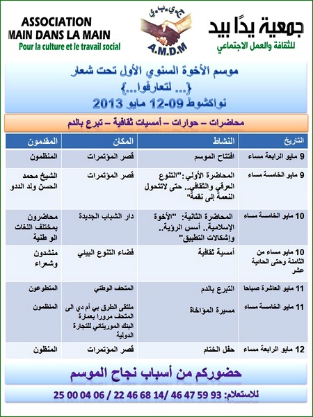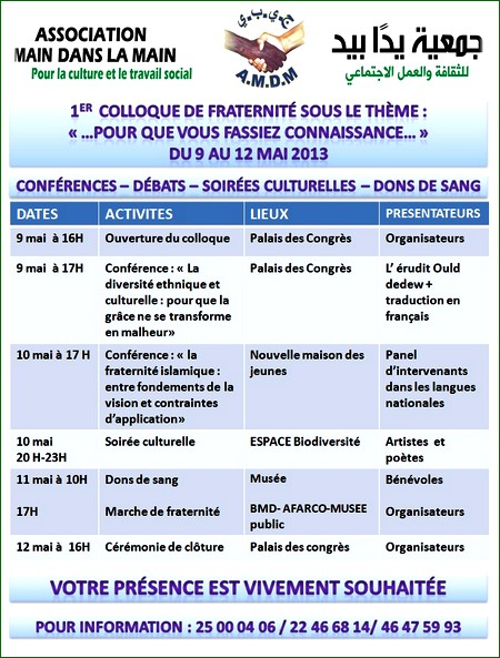 L’Association Main dans la Main Pour la Culture et l’Action Sociale invite la presse nationale et internationale à assister au premier Colloque, qu’elle organise sur la fraternité, sous le slogan (…pour que vous fassiez connaissance…).