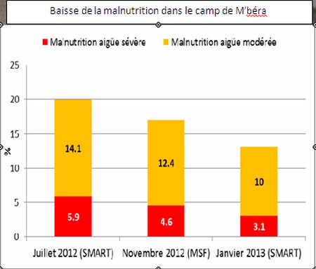 o D’importantes améliorations ont été enregistrées dans la qualité de l’aide fournie dans le camp. Plusieurs indicateurs ont démontré que le système de distribution alimentaire est plus efficace et équitable et que les taux de malnutrition dans le camp ont diminué (Cf. Graphique sur la droite). Selon les estimations, 80% des réfugiés ne sont plus en situation d’insécurité alimentaire.