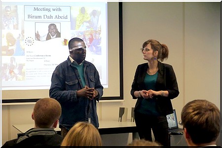 De gauche à droite: Biram Dah Abeid, lors de son exposé dans les locaux de l’UNPO (Unrepresented Nations and Peoples Organization); une traductrice membre du Staff de UNPO.