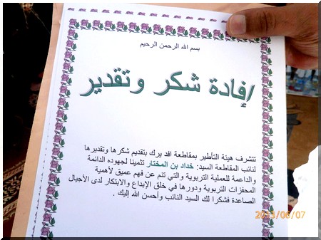 A souligner que les prix sont au nombre de 67 pour le fondamental, 13 pour le secondaire (quatre classes à Fdeirik). Les trois premiers de chaque classe du fondamental et du secondaire ont été primés, ainsi que la première fille du primaire et du collège. Des prix spéciaux ont été décernés aux deux meilleurs élèves du primaire et à 1 collégien qui s’est distingué.