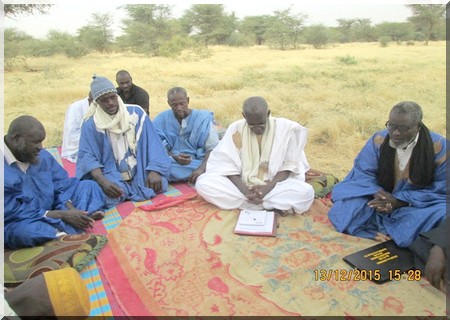 Il était 14 H 30 quand nous avons fini de faire le tour de la cuvette. Après une pause déjeunée, commence la réunion avec les paysans. La réunion s’est déroulée en présence de Cheikh Tidjani O Bleîl et de Kebad O N’Déyé, deux membres actifs de la commission locale de suivi des affaires foncières.