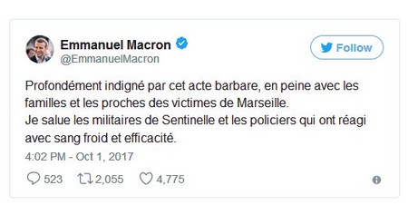 « Nous ne baissons pas la garde. Colère et tristesse pour les victimes. Soutien aux militaires et policiers de Sentinelle qui nous protègent », a réagi le Premier ministre Edouard Philippe sur les réseaux sociaux (Twitter).