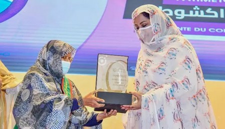 Cette distinction a été remise à la Présidente de la Commission Culturelle au Conseil Régional, la Conseillère Toutou Mint Regad qui représente Madame la Présidente aux festivités du Congrès.