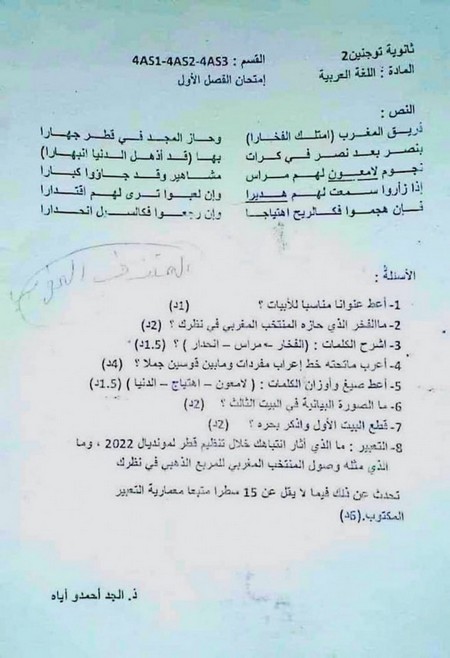 Les apprenants de l’établissement Toujounine 2 dans la préfecture de Toujounine située dans la wilaya de Nouakchott-Nord ont été invités à commenter un poème louant les mérites de l’équipe chérifienne, avec des questions sur le sujet.